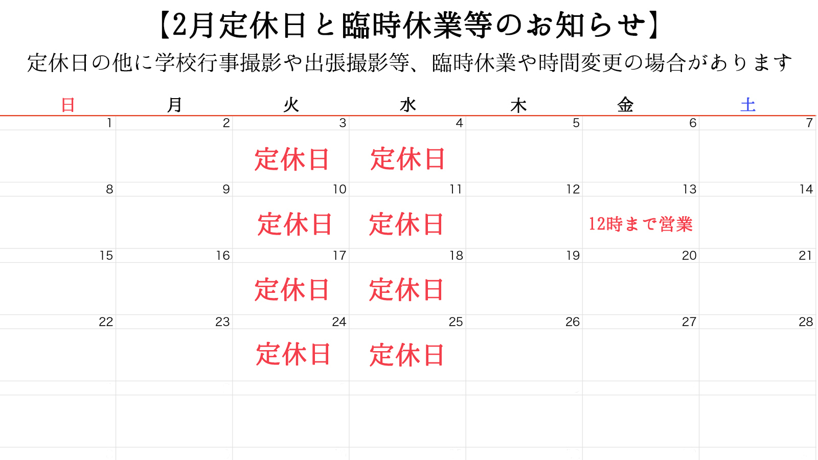 ※夫婦二人と美容スタッフで運営する小さなスタジオのため、撮影中等で電話に出ることができないことがございます。