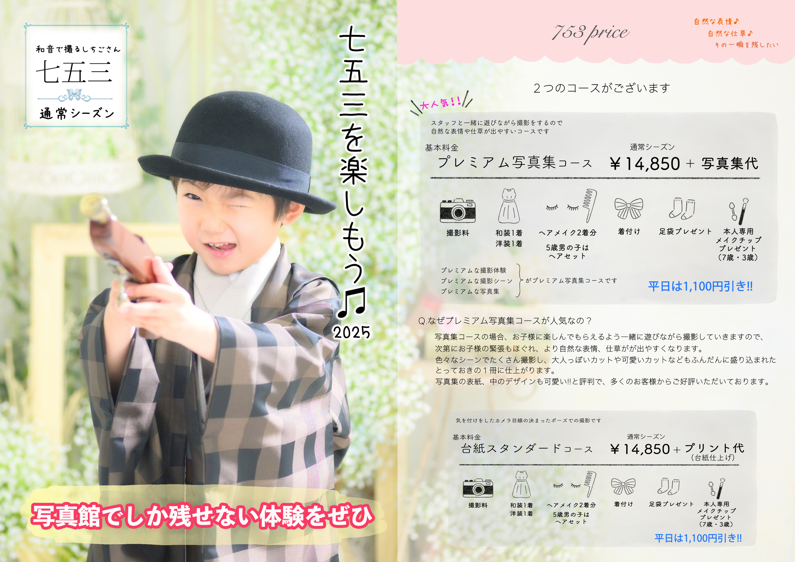 ご注文のポーズ数(最大4ポーズ)で和装全身と七分身・洋装全身と七分身のカメラ目線等、型物の記念撮影スタイルのみでの撮影となります。(当店大好評のナチュラルな撮影をご希望の場合はプレミアム写真集コースをお選びください)