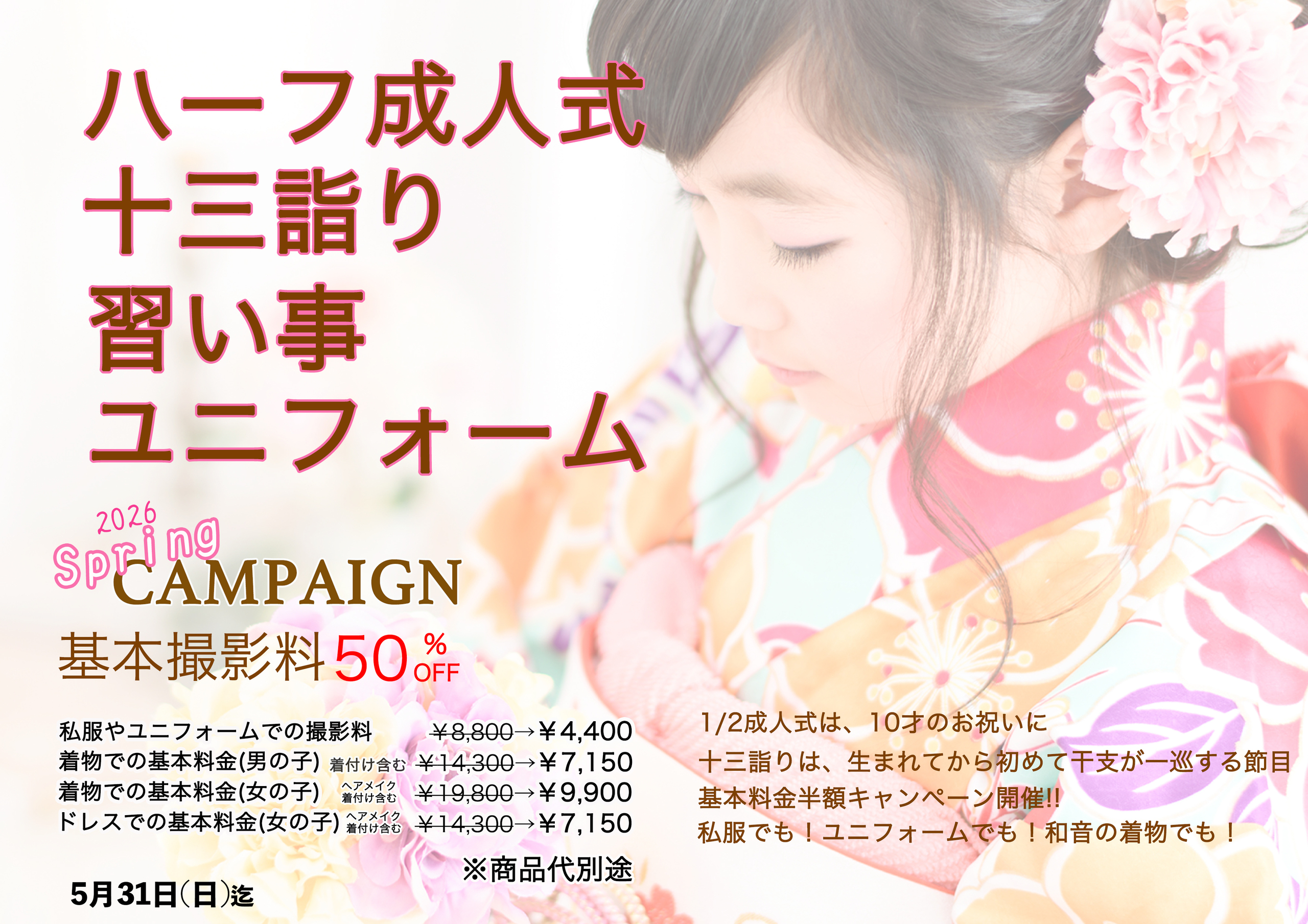1/2成人式・十三詣りどちらも当店のお着物を着て撮影ができます。